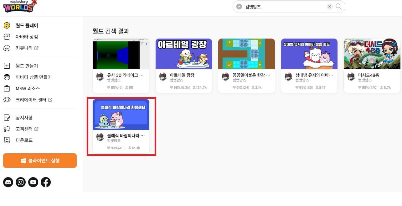 2. 컴뱃암즈를 검색 후 클래식 바람의 나라 환승센터에 접속한다.