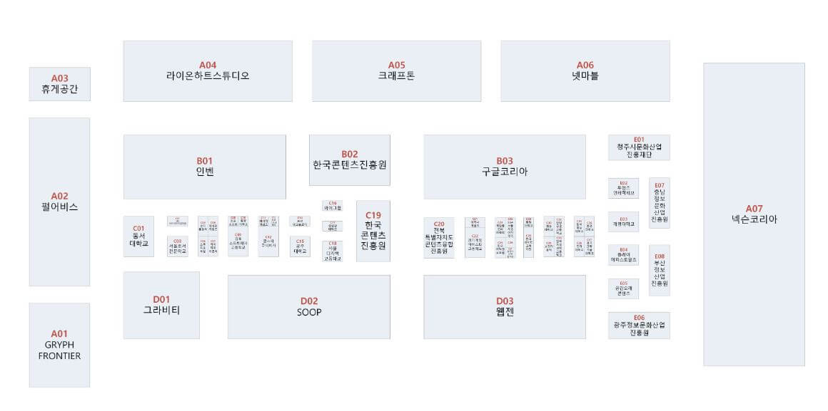 2024 지스타에 참가하는 업체 라인업으로는 넥슨, 펄어비스, 라이온하트, 크래프톤 등 쟁쟁한 업체들이 참가할 예정이며 부스 배치도는 다음과 같습니다.